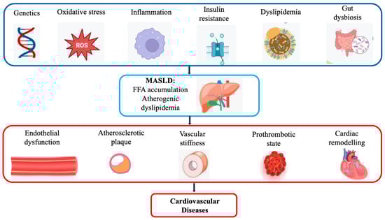 Moreover, a dysregulation of the renin–angiotensin–aldosterone system (RAAS) has been documented in patients with MASLD, which plays a role in the development of hypertension, hypertension-mediated organ damage, increased vascular resistance, and cardiac remodeling [184]. Ectopic fat accumulation in the liver also promotes endothelial dysfunction and increases sympathetic tone, leading to arterial stiffening [185].