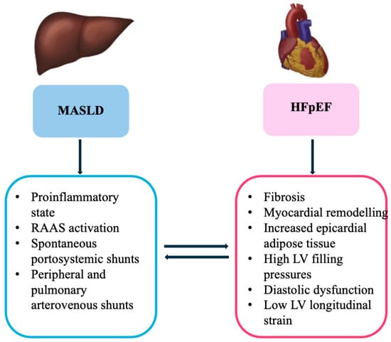 A bidirectional relationship exists between MASLD and heart failure (HF), in particular, with preserved ejection fraction (HFpEF), in a self-perpetuating cycle, where the worsening of one condition often accelerates the progression of the other [8]. Indeed, MASLD and HFpEF share common risk factors, including obesity, diabetes, and metabolic dysfunction (Figure 2).
