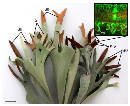 Stages of development of sporangium part on the lower side of Platycerium bifurcatum leaf: S0 (stage 0)—non-sporulating leaf, SI (stage I)—stage with young sporangium is characterized by a gray-green color in the area of developing sporangia and the presence of dense layer made of star-shaped trichomes; SII (stage II)—with immature sporangia is characterized by a weakly brown color of leaf tips, the trichomes disappear. SIII (stage III)—leaf tips with immature sporangia are intensely brown. SIV (stage IV) with mature sporangia, is characterized by an intensely brown color of leaf tips and the presence of spilling mature spores; the tips of the leaves are dried. Red color corresponds to the autofluorescence of chlorophyll; tp—trophophilic part of leaf. Abbreviations in the insert: bs—lower side of the leaf, msg—mature sporangium, sp—spores, up—upper side of the leaf. The width of the bar scale = 3 cm.
