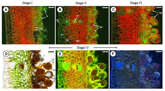 Cross-section of the sporophilic part of the Platycerium bifurcatum leaf showing the different stages of development of the sporangium side observed by epifluorescence microscopy. Red and blue colors correspond to autofluorescence of chlorophyll and lignified cell walls, respectively. (A) stage I—sporangia are poorly developed, forming a compact layer without visible chlorophyll inside; (B) stage II—a visible increase in the size of sporangia, in which chlorophyll appears, stalk cell differentiation, no spores are visible in the sporangia; (C) stage III—an increase in the size of sporangia, within which spores can be observed, intense chlorophyll fluorescence is visible in both the stalk cells and the sporangial wall, the sporangial wall is clearly visible, composed of a single layer of cells; (D–F) stage IV—mature sporangia releasing spores, Chla fluorescence is no longer observed in the sporangial cells, visible increase in lignification of leaf tissues; ue—upper epidermis; ws—water-storage tissue; pp—palisade parenchyma; sp—spores; spa—spongy parenchyma; ve—vein; sc—sclerenchyma; tr—trichomes; ysg—young sporangium, isg—immature sporangium; msg—mature sporangium; an—annulus. The width of the bar scale = 250 μm.