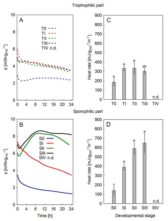 Specific heat flow (A,B) and heat rate (C,D) in the sporophilic and trophophilic parts of Platycerium bifurcatum leaves before (stage S0, T0, respectively) and during the sporulation (stage SI‒SIV, TI‒TIV, respectively); n.d.—not determined. Mean values from 5 biological replicates ±SD, marked with different letters, differ significantly according to Duncan’s test, p ≤ 0.05.