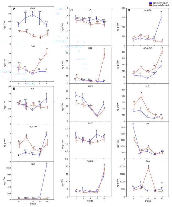 Content of selected phytohormones in the sporophilic and trophophilic parts of Platycerium bifurcatum leaves before (stage 0) and during the sporulation (stage I–IV). (A) Gibberellins: GA3, GA5; (B) auxins: indole-3-acetic acid—IAA), 5-chloroindole-3-acetic acid (5-ClIAA), indole-3-butyric acid (IBA); (C) cytokinins: trans-zeatin (tZ), trans-zeatin riboside (tZR), glucosylated trans-zeatin (tZOG), dihydrozeatin (DHZ), dihydrozeatin riboside (DHZR), (D) (±)-cis, trans-abscisic acid (ABA) abscisic acid glucosyl ester (ABA-GE), jasmonic acid (JA), salicylic acid (SA), benzoic acid (BeA). Mean values from 3 independent biological replicates presented in a single graph and marked with different letters differ significantly according to Duncan’s test, p ≤ 0.05.