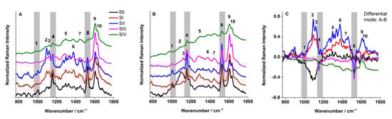 Anatomical cross-sections of selected leaf fragments (Figure 2), combined with fluorescence imaging of the investigated plant tissues, provide strong corroborative evidence for the changes observed in the FT-Raman spectra (Figure 6) and the Raman mapping results (Figure 7). A comparative analysis of the fluorescence images (Figure 2), which correspond to tissues sampled in stages SI, SII, SIII, and SIV, respectively, clearly confirmed dynamic alterations in the content, spatial distribution, and composition of pigments within the analyzed leaf tissues. A progressive shift in pigment content is apparent when comparing sections from stages SI to SIII (Figure 2A–C). In stage SI, the emergence of a developing trichome layer is evident, while stage SII reveals the formation and early development of sporangia. Figure 2C, corresponding to stage SIII, reflects compositional changes in the pigment profile, accompanied by an increase in Car accumulation. In contrast, stage SIV (Figure 2D–F) exhibits only minimal fluorescence associated with Chl and Car, which can be attributed to tissue desiccation during the final stages of spore formation.