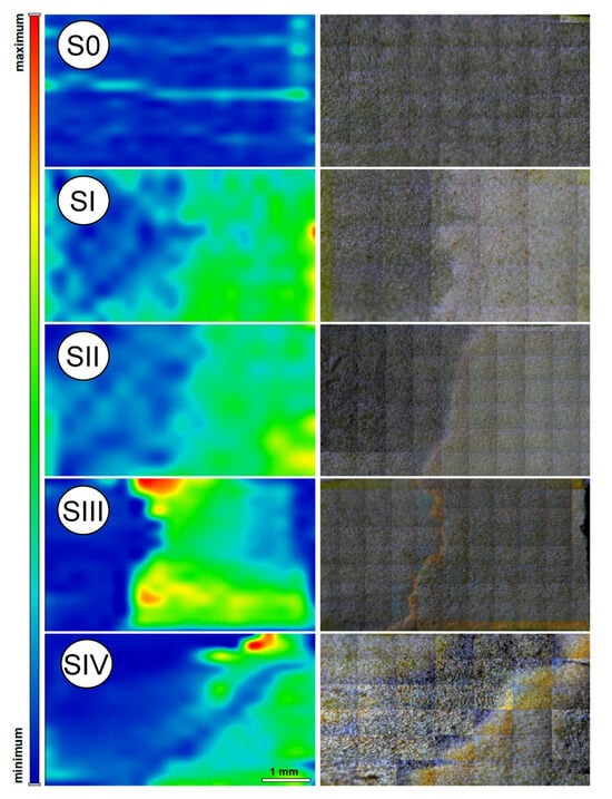 2-D Raman maps of Platycerium bifurcatum leaf (sporophilic part) in their various sporulation phases: S0—non-sporulating leaf; stage I (SI) leaf with young sporangium; stage II and III (SII and SIII) respectively, leaves with immature sporangium; stage IV (SIV)—leaf with mature sporangium. The grey panel (the right panel)—raw photos from the apparatus. Colored panel (the left one) presents integrated bands related to -C=C- stretching vibration modes (1525 cm−1) and painted according to carotenoids content (blue—minimum content, red—maximum content). At stage S0, the Car concentration was relatively low and homogeneously distributed across the mapped area. In subsequent stages (SI and SII), pigment levels increase and remain comparable between these stages, with enhanced localization in the sporophilic parts, green areas in Figure 6. Transition to stage SIII—corresponding to spore maturation—was marked by an insignificant reduction in the overall surface area expressing carotenoid signals, alongside the emergence of distinct high-intensity zones (represented in yellow and red). These hotspots are likely associated with intersporangial tissues undergoing localized pigment accumulation. The border between trophophilic and sporophilic tissue becomes significantly more defined. Finally, the Raman map of the leaf in stage SIV reveals almost a complete loss of carotenoid-associated signal, reflecting the presence of fully matured spores and the onset of desiccation in living tissues.