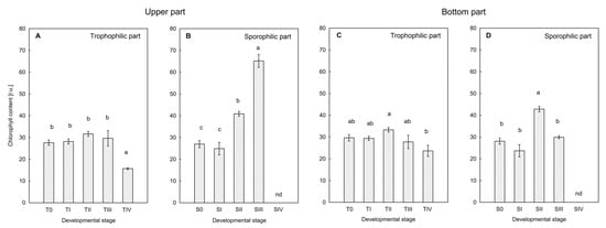Changes in chlorophyll content in trophophilic (A,C) and sporophilic parts (B,D) of Platycerium bifurcatum leaf were measured non-destructively on the upper and lower sides of the leaf blade, in subsequent sporulation stages SI‒SIV/TI‒TIV and in a non-sporulating leaf (S0/T0); nd—not determined. Mean values from 6 independent biological replicates, different letters indicate significant differences according to Duncan’s test, p ≤ 0.05.