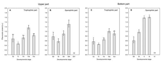 It was shown that the content of flavonoids (Flav) in the trohophylic part of both the upper (Figure 8A) and bottom side (Figure 8C) of the leaves varied similarly. A significant increase in the Flav content was observed at stage SIII relative to earlier stages, S0, SI, and SII. In the sporophilic part on the upper side of the leaf blade, the Flav content also increased rapidly at stage SIII (Figure 8B). However, on the bottom side, this increase was already observed at stage SII, and remained at a similar level also at stage SIII (Figure 8D). Due to the large lignification of the sporophilic part of the leaves in the SIV stage, the content of Flav on both the upper and bottom sides of the leaf blade was not measurable.