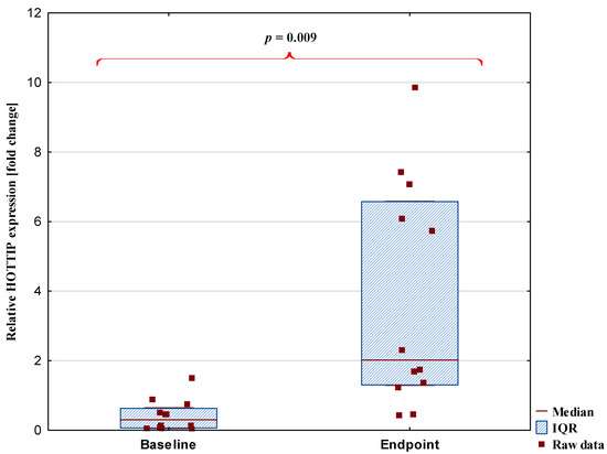 Difference in HOTTIP lncRNA expression levels between baseline and endpoint. Data are presented as median [interquartile range, IQR]. The p-value after correction for multiple testing was p = 0.024.