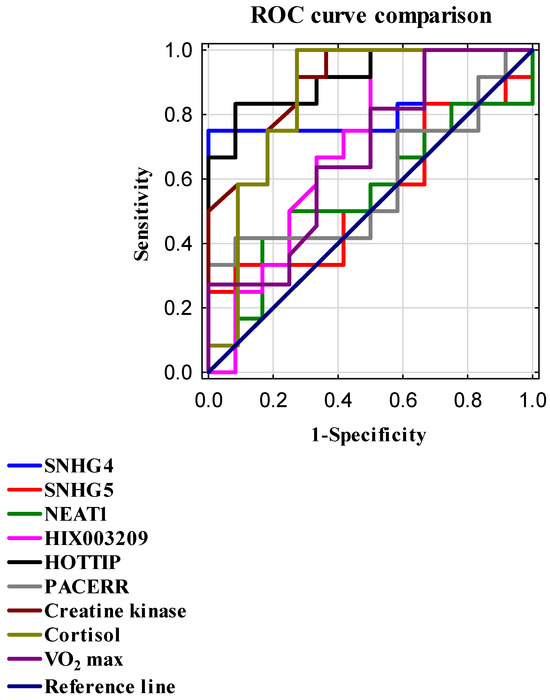 ROC curves were generated to compare the diagnostic performance of selected biomarkers and lncRNAs in assessing training effectiveness. The reference line (AUC = 0.5) indicates no discriminative ability. Sensitivity (true positive rate) is plotted on the Y-axis, while 1—specificity (false positive rate) is plotted on the X-axis. Both metrics are expressed as normalized values ranging from 0 to 1.