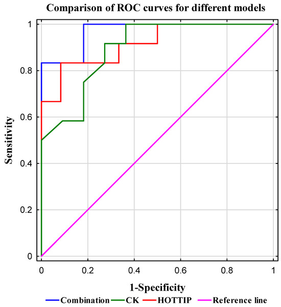 Comparison of ROC curves for different models. The plot shows the sensitivity versus specificity for three models: combination (blue line), CK (green line), and HOTTIP (red line). The reference line (AUC = 0.5) indicates no discriminative ability. Sensitivity (true positive rate) is plotted on the Y-axis, while 1—specificity (false positive rate) is plotted on the X-axis. Both metrics are expressed as normalized values ranging from 0 to 1. The combination model demonstrates the highest sensitivity and specificity, followed by HOTTIP and CK.
