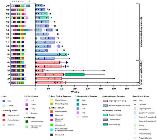 Treatment with immune checkpoint inhibitors (ICIs) in advanced non-small cell lung cancer (NSCLC) patients without targetable genetic alterations demonstrate long-lasting therapy response and overall survival (OS) in a subset of patients [1]. However, programmed death ligand 1 (PD-L1) expression—the only biomarker approved for clinical practice—and other candidate predictive biomarkers such as tumor mutational burden (TMB), and HLA expression insufficiently discriminate tumor responders from non-responders [2,3,4,5,6]. Moreover, after initial response to treatment, the disease will evolve in most patients to progressive disease, that can either be systemic progression (SP) or oligoprogression (OP). OP is defined as the growth or new appearance of a limited number (up to 5) of metastases under systemic treatment [7,8]. These limited number of metastases must be suitable for local ablative treatment such as surgery or ablative radiotherapy. OP differs clinically from SP by the limited number of progressing lesions and the continuation of systemic treatment combined with local radical treatment of the metastatic side (s), which is associated with prolonged survival compared to SP [9,10,11]. In clinical practice, the assessment of OP often remains challenging, as it may be reclassified as SP shortly after local radical treatment, retrospectively indicating that it should have been classified initially as SP. Misclassification of OP leads to unnecessarily prolonged ICI treatment of patients with expensive, ineffective drugs [12,13]. Therefore, biomarkers are needed to distinguish true OP from SP in patients treated with ICI.