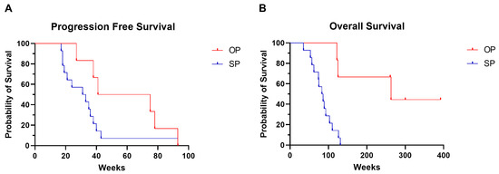 Median PFS of the whole cohort was 37 weeks (range 17–93 weeks), median OS 98 weeks (range 35 weeks—not reached) and median duration of treatment was 46 weeks (range 15–105 weeks). Both OS (262 weeks vs. 85 weeks, p = 0.002) and PFS (58 weeks vs. 34 weeks, p = 0.04) were significantly longer in the OP group (Table 1, Figure 2). Patients with SP were more likely to have a higher metastatic load when looking at both the total number of metastases and the metastatic organs involved at baseline, although these differences were not significant. Based on the clinical–pathological and treatment response data, OP only differed significantly from SP by survival (Table 1).