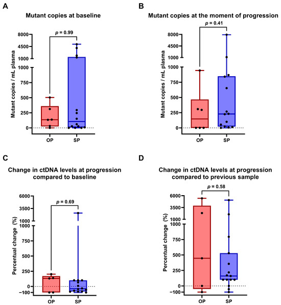 Comparison of total mutant ctDNA levels between patients with OP (red) and without OP (blue). Barplots depicting differences in total levels of mutant ctDNA. (A) At baseline, ranging from 0 to 503 (median 135) copies/mL plasma in OP and from 0 to 5169 (median 106) copies/mL plasma in SP (p = 0.99) and (B) at progression ranging from 0 to 943 (median 148) copies/mL plasma in OP and ranging from 0 to 7914 (median 228) copies/mL plasma in SP (p = 0.41). (C,D) Barplots depicting changes in ctDNA levels at OP or SP compared to either baseline (p = 0.69) (C) or the sample measured before the moment of (oligo)progression (p = 0.58) (D). Mann–Whitney test p-values < 0.05 are considered significant.