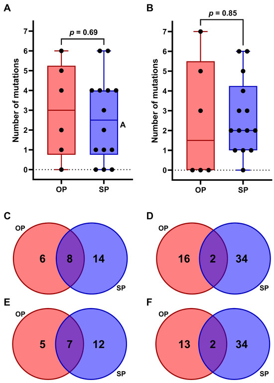 Comparison of number of variants found in patients with OP (red) or SP (blue). (A) Barplot depicting number of mutations found at baseline (p = 0.69) (B) Barplot depicting number of mutations found at OP or systemic progression (p = 0.85). p-values < 0.05 are considered significant. (C,D) Venn diagram showing the overlap and difference in unique variants between OP and SP at baseline on gene level (C) and variant level (D–F). Venn diagram showing the overlap and difference in unique variants between OP and SP at progression on gene level (E) and variant level (F).