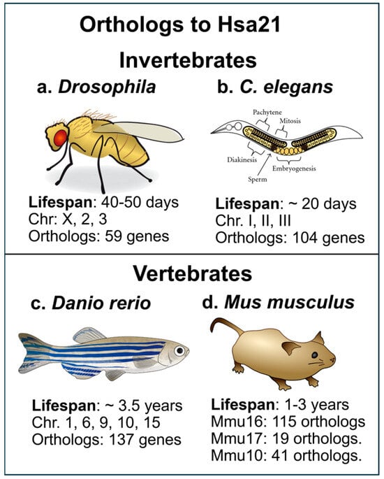 (a) The fruit fly, Drosophila melanogaster, has a lifespan of 40–50 days and has been used to investigate pathways that are orthologous to Hsa21 changes, for example, the calcineurin pathway; (b) The C. elegans nematode has also been used for examining specific alterations in molecular pathways caused by Hsa21 trisomy in humans. Developmental and age-related molecular and behavioral changes in genes dispersed over chromosomes can be tested in this invertebrate; (c) The zebrafish (Danio rerio), a ray-finned fish with translucent fry which are often used in developmental studies, since the entire fish embryo can be imaged and show distribution of dysregulated gene products; (d) The mouse, Mus musculus, is the most common lab animal and has been easier to manipulate than the rat. The mouse has an average lifespan of 1–3 years, with Hsa21 orthologs dispersed over MMU16, 17, and 10. From: (a): https://commons.m.wikimedia.org/wiki/File:Drosophila-drawing.svg (accessed on 2 May 2025); (b): https://commons.wikimedia.org/wiki/File:C-elegans-Schematic-drawing-of-the-two-gonads-and-uterus-of-C.jpg (accessed on 2 May 2025); (c): https://commons.wikimedia.org/wiki/File:201108_zebrafish.png (accessed on 2 May 2025); (d): https://commons.wikimedia.org/wiki/File:Mouse.svg (accessed on 2 May 2025).