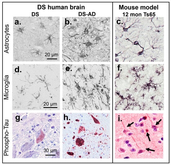 Comparison of pathology in the human brain with DS (a,d,g) or DS-AD (b,e,h) and Ts65Dn mice (c,f,i). Astrocytes in the hippocampus gray matter exhibit a resting morphology in a 25-year-old (YO) with DS without dementia (a), compared to the activation and increased immunostaining with antibodies directed against glial fibrillary acidic protein (GFAP) in an individual with DS-AD (b) [] and the increased GFAP staining in hippocampus of a 12-month-old Ts65Dn mouse (c) []. Microglial activation (stained with Iba1 antibodies) was not observed in a 37-year-old male with DS and no dementia (d) but was frequently observed in DS-AD cases (e) [] and in the 12-month-old Ts65Dn mouse (f) []. The locus coeruleus (LC) in a young (25 YO) individual with DS did not exhibit frank neurofibrillary tangles (NFTs), but a few neurons stained for an oligomeric Tau antibody (TOC1, red chromophore, (g) []. In DS-AD, frequent AT8-positive tangles and fibers were observed throughout the brain (here a 54-year-old male with DS-AD, red chromophore, (h). The mouse brain does not naturally develop NFTs, unless a human mutated tau transgene is introduced, or after injections with human p-Tau (i). Tangle-like p-Tau inclusions (see arrows) in large cortical neurons adjacent to an exosome injection from a DS-AD participant’s plasma [].