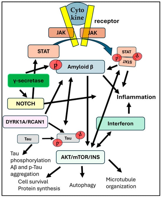 Figure 3. The complex interaction between pathways that are affected by trisomy 21. Arrows signify pathway cross-talks or one-directional influences between distinct pathways. The JAK/STAT pathway is activated by cytokine binding to the receptor and can influence the expression and activity of BACE1 (β-secretase), which is involved in the amyloidogenic pathway. mTOR hyperphosphorylation is linked to increased p-Tau aggregation. Both Notch and APP are processed by γ-secretase. While γ-secretase inhibitors can reduce Aβ production, they also inhibit Notch signaling, which can negatively influence important cellular processes. The interferon (IFN) and Notch pathways interact to influence immune response. The over-production of interferon receptors in DS may have consequences for cell survival and growth factor function, thus interacting also with the mTORC1 or mTORC2 complexes. Dyrk1A and RCAN 1 (both located on Hsa21) can affect amyloid production by phosphorylating APP and are also involved in hyperphosphorylation of tau. Finally, the Notch signaling pathway is involved in neuroinflammation, influencing microglia activation, cytokine release, and the integrity of the BBB. P-tau can promote amyloid-beta (Aβ) production, and Aβ, in turn, can drive tau phosphorylation. Modulating the JAK/STAT pathway is explored as a potential therapeutic strategy for AD, aiming to reduce neuroinflammation, restore neuronal function, and potentially impact amyloid pathology.