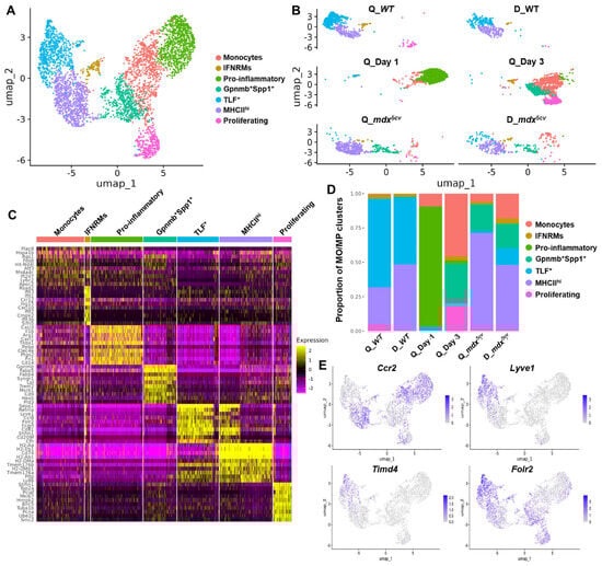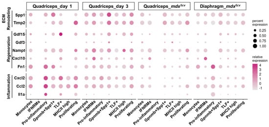 2.5. Different Monocyte/Macrophage Subclusters Express Genes Differentially Involved in Muscle Inflammation, Regeneration, and ECM Remodeling
