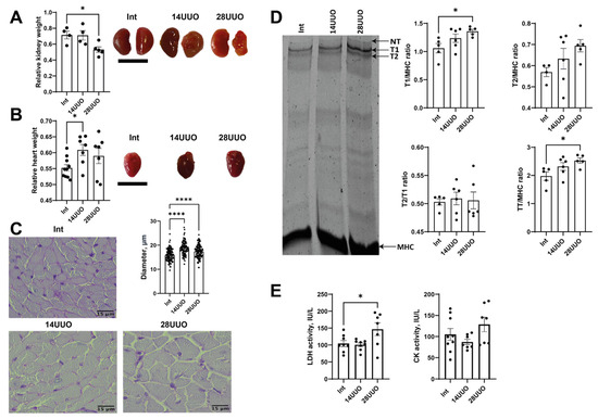 Figure 1. Markers of altered cardiac morphology in RCS 4 of varying duration. Changes in the weight and morphology of the (A) left kidney and (B) heart in response to obstructive nephropathy in mice. Scale bar: 1 cm. Number of mice per group: (A) Int—4; 14UUO—4; 28UUO—5; (B) Int—11; 14UUO—8; 28UUO—8. (C) Cardiomyocyte diameter assessment in PAS-stained cardiac muscle sections. Scale bar: 15 µm. Number of mice per group: Int—5; 14UUO—5; 28UUO—5. (D) Quantitative analysis of sarcomeric titin content in myocardium under RCS4 induced by obstructive nephropathy. The right panel shows a representative electrophoretogram fragment with arrows indicating titin isoforms and MHC bands. Number of mice per group: Int—5; 14UUO—6; 28UUO—6. (E) Plasma LDH and CK enzyme activity in obstructive nephropathy of different durations. Number of mice per group: Int—13; 14UUO—12; 28UUO—12. * p < 0.05, **** p < 0.0001 statistically significant differences compared to the control (“Int”) group (one-way ANOVA, Dunnett’s post hoc test).