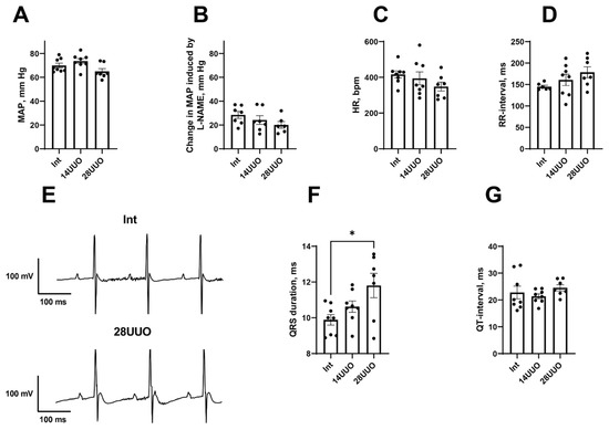 Figure 2. Hemodynamic variables and ECG parameters in UUO. (AD): MAP (A), MAP response to L-NAME administration (B), HR (C), and RR-interval duration (D) in the three groups of mice. (E): Fragments of representative ECG recordings showing QRS prolongation in 28UUO group compared to the Int group. (F,G): durations of QRS complex and QT-interval in the three groups of mice. Number of mice per group: Int—8; 14UUO—8; 28UUO—7. * p < 0.05—statistically significant difference compared to the Int group (one-way ANOVA, Dunnett’s post hoc test).