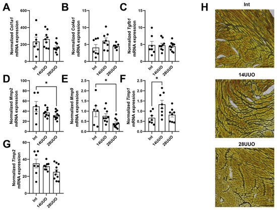 Figure 3. Expression of fibrosis markers (AC) and remodeling markers (DG) in the cardiac muscle in response to RCS4. Number of mice per group: (AG) Int—7; 14UUO—9; 28UUO—10. (H) Staining of cardiac muscle sections for reticulin using Gordon–Sweet method. Scale bar: 100 µm. Number of mice per group: Int—5; 14UUO—5; 28UUO—5. * p < 0.05—statistically significant differences compared to the “Int” group (one-way ANOVA, Dunnett’s post hoc test). Exact p-values: (D): Int vs. 28UUO—p = 0.0381; (E): Int vs. 28UUO—p = 0.0168; (F): Int vs. 14UUO—p = 0.0115.