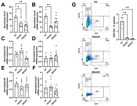 Figure 4. Expression profile of proinflammatory chemokines (A,B), cytokines (CE), and prostaglandin synthesis regulator (F) in the heart at different time points of UUO. Number of mice per group: (AF) Int—5; 14UUO—7; 28UUO—10. (G) Analysis of CD11b+ macrophage content in the heart at different stages of UUO. Representative dot plots show the percentage of cells in the parent gate. Number of mice per group: Int—3; 14UUO—3; 28UUO—3. * p < 0.05, ** p < 0.01—statistically significant differences compared to the “Int” group (one-way ANOVA, Dunnett’s post hoc test). Exact p-values: (A): Int vs. 14UUO—p = 0.0364, Int vs. 28UUO—p = 0.005; (B): Int vs. 14UUO—p = 0.0078; (G): Int vs. 14UUO—p = 0.0024, Int vs. 28UUO—p = 0.0019.