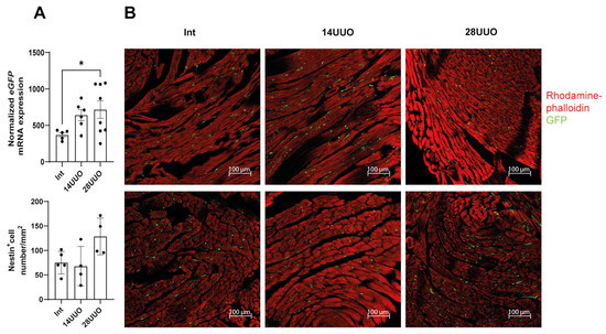 Figure 5. Effect of UUO on GFP-positive cells in the heart. (A) eGFP mRNA levels analysis. Number of mice per group: Int—7; 14UUO—7; 28UUO—8. (B) Distribution and number of nestin-positive cells in cryosections of mouse hearts with different UUO durations, stained with rhodamine–phalloidin. Upper panel (B): longitudinal sections of the left ventricle, lower panel (B): transverse sections. Rhodamine–phalloidin stains the actin cytoskeleton, and GFP labels nestin-positive cells. Scale bar: 100 μm. Number of mice per group: Int—5; 14UUO—4; 28UUO—4. * p < 0.05—statistically significant differences compared to the “Int” group (one-way ANOVA, Dunnett’s post hoc test). For each sample, ten fields of view were obtained.