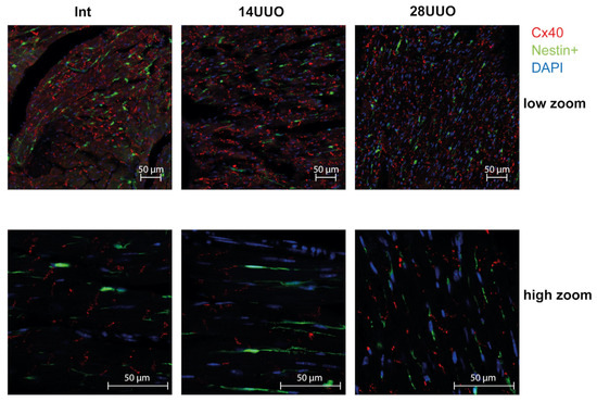 Figure 6. Representative confocal images of left ventricle cryosections from mice with different UUO durations, stained with DAPI and antibodies against connexin 40. Scale bar: 50 μm. Number of mice per group: Int—5; 14UUO—4; 28UUO—4. For each sample, ten fields of view were obtained.