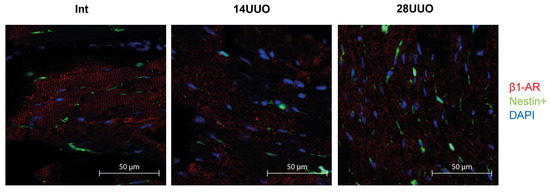Figure 7. Representative confocal images of left ventricle cryosections from mice with different UUO durations, stained with DAPI and antibodies against β1-adrenergic receptor. Scale bar: 50 μm. Number of mice per group: Int—5; 14UUO—4; 28UUO—4. For each sample, ten fields of view were obtained.