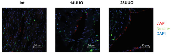 Our studies in intact mice and UUO-induced RCS4 models demonstrate that nestin-positive cells lack expression of the following markers: the cardiomyocyte markers Cx40 and β1-AR (Figure 6 and Figure 7, respectively), the cardiogenic marker GATA4 (Figure 8), and the vascular endothelial marker vWF (Figure 9). However, they exhibit a TBX5+SCA-1+ phenotype (Figure 10A,B). While SCA-1 was originally identified in hematopoietic stem cells, it also marks CPCs in the heart. The SCA-1+ cardiac cell population displays a mesenchymal phenotype (PDGFRα+CD44+CD90+) and may differentiate into cardiomyocytes and endothelial and smooth muscle cells [53]. TBX5, a transcription factor regulating cardiogenesis, also controls nestin gene expression [54,55] and persists in the adult CPC subpopulation [8].