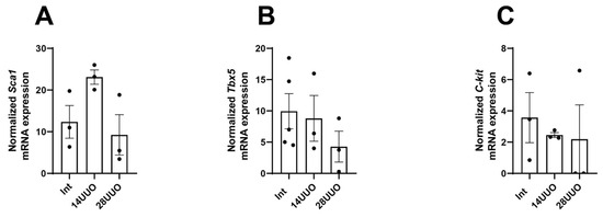 Figure 10. mRNA expression of CPC markers Sca-1 (A), Tbx5 (B), and C-kit (C) in GFP+ cardiac cells at different UUO time points. Number of mice per group: (A) Int—3; 14UUO—3; 28UUO—3; (B) Int—5; 14UUO—3; 28UUO—3; (C) Int—3; 14UUO—3; 28UUO—3. One-way ANOVA, Dunnett’s post hoc test.