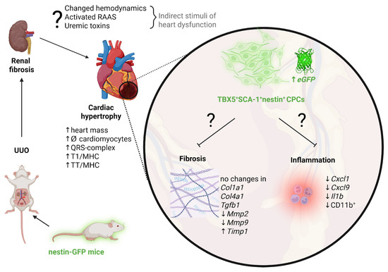 Thus, we propose that nestin+TBX5+SCA-1+ cells represent a CPC population that may exert regenerative potential during UUO-induced RCS4. However, the exact mechanism underlying this compensatory response that prevents cardiac fibrosis in RCS4 is challenging to elucidate. We hypothesize that UUO-mediated cardiac hypertrophy may be caused by the activation of the renin–angiotensin–aldosterone system, hemodynamic alterations, and accumulation of uremic toxins in acute/chronic kidney disease [56]. The development of cardiac hypertrophy may stimulate the activation of the CPC pool, which exerts its regenerative potential by suppressing fibrosis and the inflammatory response. The signaling pathways mediating these protective mechanisms in the myocardium under UUO-induced RCS4 remain to be elucidated in future studies. A potential mechanism for the progression of cardiac dysfunction in primary CKD and the role of nestin-positive cells in this process is illustrated in Figure 11.