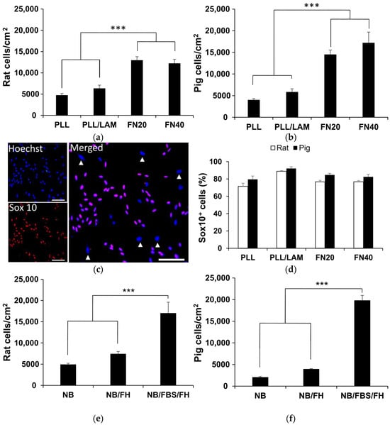 Growth of peripheral nerve cells on plastic cell culture plates with different surface coatings and cell culture media. Cells were seeded at 5000/cm2 and fixed after three days in vitro. (a,b) Total cell counts for rat (a) and pig (b) cells achieved on the indicated substrates, using the same NB/FBS/FH cell culture medium. FN20 and FN40 are used as abbreviations for the substrate coating comprising PLL/heparin/bFGF/fibronectin, with fibronectin used at 20 µg/mL or 40 µg/mL, respectively. (c) Representative image of cell nuclei quantified in (a), with SCs nuclei identified by Sox10 expression (double stained in red and blue colors). White arrowheads signal large cell nuclei from presumptive fibroblasts negative for Sox10. (d) Percentage of Sox10-positive rat and pig cells across the different substrates. (e,f) Total cell counts for rat (e) and pig (f) cells achieved in different cell culture media. Cells in (e,f) were grown on PLL/heparin/bFGF/fibronectin (40 µg/mL)-coated surfaces. Data represent the mean ± SEM. Statistical analysis was performed using two-way ANOVA and Holm–Sidak post hoc test. *** p < 0.001. Scale bar in (c): 100 µm.