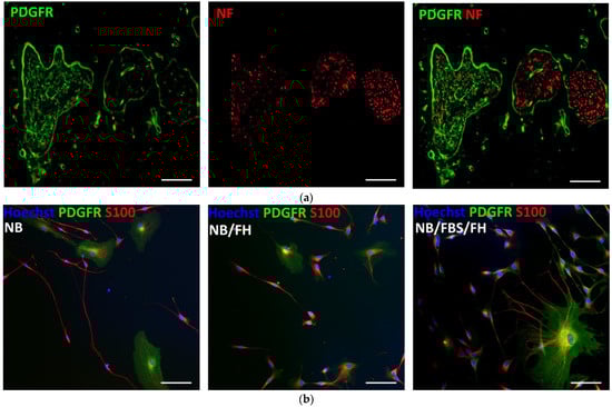 Peripheral nerve sections were reacted with antibodies against neurofilament (NF) to label axons and anti-platelet-derived growth factor receptor (PDGFR) to identify fibroblasts. With this double staining, the nerve connective tissue ensheathments effectively showed intense PDGFR signal around the axonal fascicles (Figure 2a). Subsequently, PDGFR and S100 protein immunocytochemistry was used to obtain additional information on cell morphology and phenotypes growing from peripheral nerve cells cultured on PLL/heparin/bFGF/fibronectin-coated surfaces. In agreement with counts of Sox10+ cells (Section 2.1), at 3 DIV, most cells in vitro had bipolar shape and small size and were strongly positive for S100, which are typical characteristics of Schwann cells [,]. Consistent with the observation of large cell nuclei negative for Sox10 (Figure 1c), a scatter of cells frequently showed large amoeboid cytoplasm and intense staining for PDGFR (Figure 2b), likely representing a remnant of fibroblasts from the perineurium and endoneurium. Few fibroblast-like cells were observed in the cell cultures, irrespective of the cell culture media (Figure 2b).