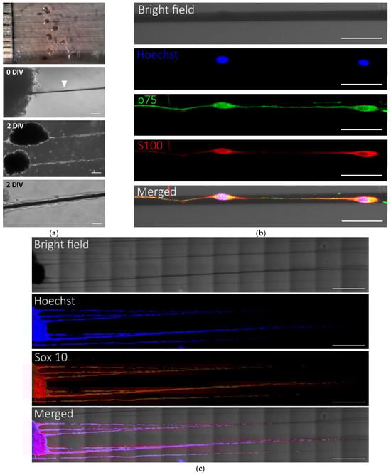 Cell growth from preconditioned sural nerves on PLL/heparin/bFGF/fibronectin-coated PCMFs. (a) Phase contrast microphotographs showing the appearance of nerve explants and migratory cells on PCMFs; Top panel: macroscopic appearance of a cell culture plate with PCMFs and recently attached nerve segments. Second panel: scarce cells (arrowhead) migrate on the PCMFs the first day in vitro (DIV). Third panel: migratory cell chain established by 2 DIV. Bottom panel: microphotograph at higher magnification illustrating the appearance of cells on the microfibers at 2 DIV. (b) Confocal immunofluorescence images of cells at the growth front showing positive staining for p75 (green) and S100 (red), which are the characteristic markers of Schwann cells. (c) Confocal microscopy images exemplifying peripheral nerve cell growth for 7 DIV on PCMFs. The cultures were fixed and processed for Sox10 immunocytochemistry combined with Hoechst nuclear staining. Scale bars: (a), 100 µm, 200 µm, 25 µm; (b), 50 µm (c) 1 mm.