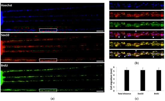 Cell proliferation from preconditioned rat nerves on PLL/heparin/bFGF/fibronectin-coated PCMFs. (a). Representative confocal fluorescence images of cells at 7 DIV, stained for Sox10, BrdU, and Hoechst. Proliferating (BrdU+) cells are distributed along the entire length of the microfibers. (b) Higher magnification of the boxed region in (a). Although most cells are proliferating SCs, a few Sox10-negative, non-dividing cells are also present on the PCMFs (arrowheads). (c) Average distance traveled by cells on PCMFs as assessed by the different markers. Scale bars: (a), 200 µm; (b) 20 µm.