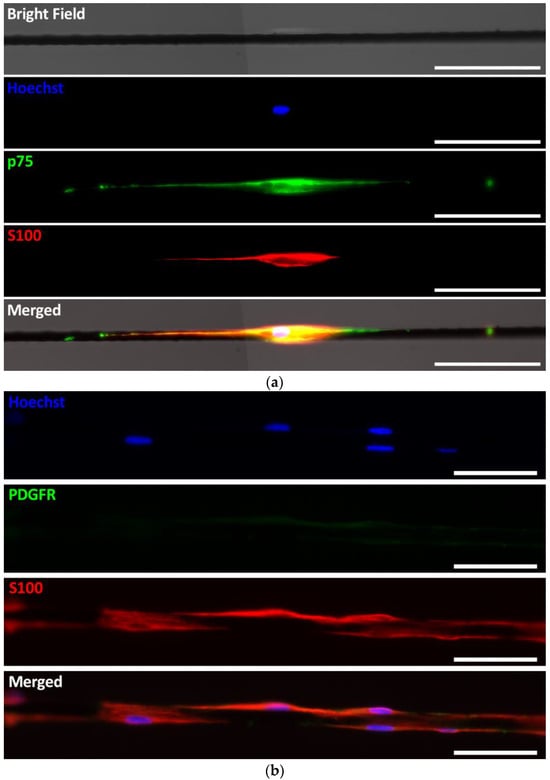 Immunostaining of Schwann cells from preconditioned porcine peripheral nerves growing on PLL/heparin/bFGF/fibronectin-coated PCMFs for 7 DIV. (a) Confocal fluorescence images of cells showing immunoreactivity for p75 (green) and S100 (red), the typical markers of SCs. (b) S100 (red) expressing SCs showing no labeling for fibroblast markers such as PDGFR (green). Scale bars: (a), 100 µm; (b) 50 µm.
