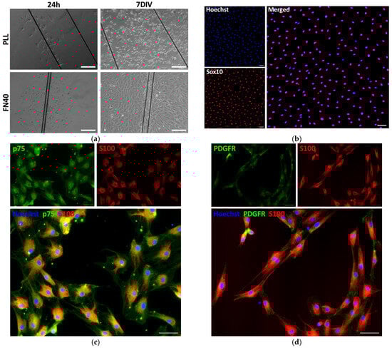 Sub-culture of cells migrating on PCMFs. Microfibers with attached cells were cut at 7 DIV and placed on plastic cell culture plates for an additional period of 7 days. (a) Representative phase-contrast microphotographs of cells after 1 or 7 days on plastic surfaces coated with PLL alone or with PLL/heparin/bFGF/fibronectin-40. (b) Cell immunostaining for Sox10 (red) at 7 DIV in PLL/heparin/bFGF/fibronectin-40 coated plates. (c,d) Confocal fluorescence images of cells processed for p75 (green) and S100 (red), or PDGFR (green) and S100 (red). Scale bars: (a), 200 µm; (b,d) 50 µm.