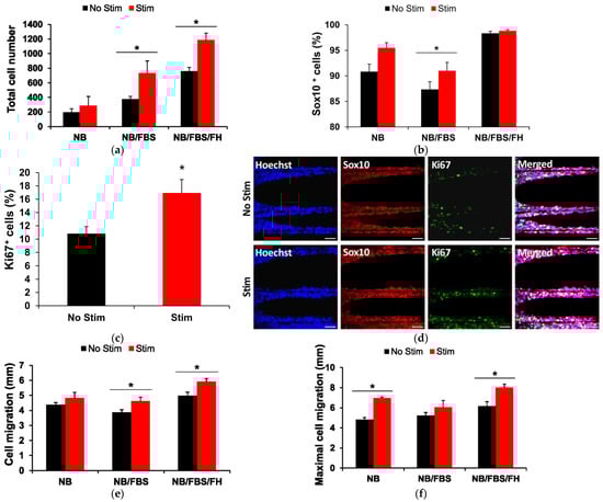 Biological effects of electrical stimulation (ES) applied through PCMFs to rat peripheral nerve cells. ES was initiated two days after placement of preconditioned sural nerves on PCMFs. Three different cell culture media were used for cell assessment, namely NB, NB/FBS, or NB/FBS/FH. Cells were fixed at 7 DIV and processed for immunocytochemistry. (a) Average number of migrating cells per microfiber in absence of stimulation (black columns) or after ES applied for 5 days (red columns). (b,c) Percentage of cells positive for Sox10 and Ki67, respectively. Quantification of Ki67-positive cells was performed only for cells in NB/FBS/FH. (d) Representative confocal fluorescence images of cell cultures analyzed in (c). (e,f) Mean (e) and maximal (f) cell migration per microfiber. Statistical significance was assessed using two-way ANOVA and Holm–Sidak post hoc test. Only the statistical differences detected when comparing stimulated and non-stimulated cells are indicated in the graphs. * p < 0.05. Scale bar in (d): 50 µm.