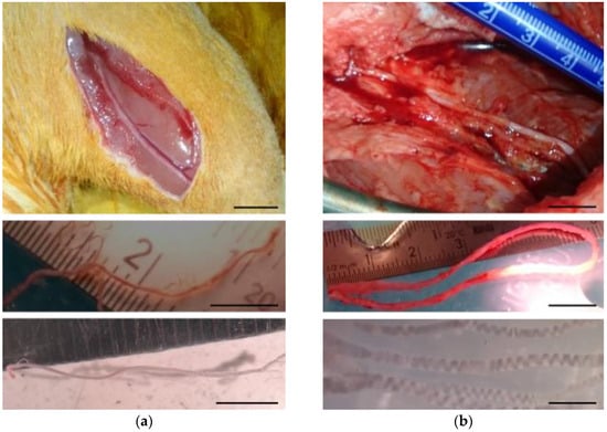 Sural nerves were also obtained from 2-month-old Large White female pigs (Sus scrofa domesticus) purchased from a commercial supplier (Granja Agropardal, Toledo, Spain). In this case, the surgical procedures were performed under inhalational anesthesia. Anesthesia was induced by intramuscular (IM) injection of ketamine (Eurovet Animal Health B.V., Bladel, The Netherlands; 10 mg/kg), midazolam (Laboratorios Normon, S.A., Madrid, Spain; 0.1 mg/kg), and medetomidine (Laboratorios Syva, S.A., León, Spain; 0.02 mg/kg), followed by intravenous (IV) administration of propofol (UAB Norameda, Klaipeda, Lithuania; 3 mg/kg). Then, a tracheal tube was placed, and the anesthesia was maintained with sevoflurane (AbbVie S.r.l, Campoverde di Aprilia, Italia; 1.7–2%) together with remifentanil (Laboratorio Reig Jofré, S.A., Barcelona, Spain; 26 mg/kg/h IV) and rocuronium (N.V. Organon, Oss, Netherlands; 1.2 mg/kg/h IV). Mechanical ventilation (Fabius Tiro, Dräger, Lübeck, Germany) was set at 12–14 breaths/min with a tidal volume of 10–15 mL/kg. Heart rate, blood pressure, exhaled carbon dioxide, blood oxygen saturation, and inspired and expired sevoflurane levels were monitored (Infinity Delta, Dräger, Lübeck, Germany). About 10 cm of nerve was removed and placed in cold HBSS (Figure 8b).