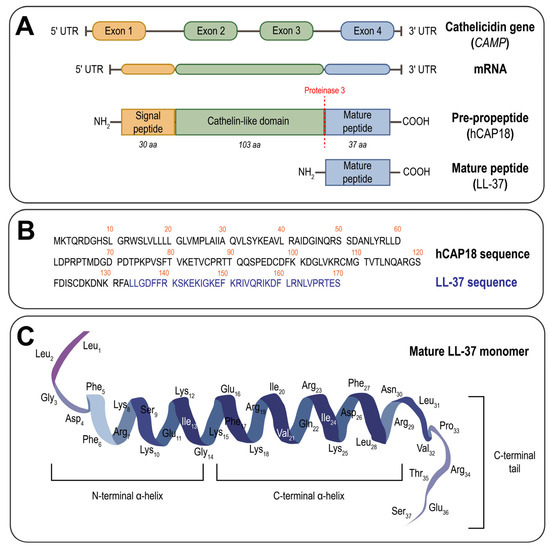 The only human cathelicidin is LL-37 (AMP, Uniprot P49913; LLGDFFRKSKEKIGKEFKRIVQRIKDFLRNLVPRTES), a 37-residue peptide named after its N-terminal leucine-leucine motif. Its precursor, human cationic antimicrobial peptide-18 (hCAP18), is encoded by the CAMP gene located on chromosome 3p21.31 (Figure 1A,B). CAMP contains four exons and encodes a 170-amino-acid prepropeptide [19,20]. LL-37 is produced by a wide range of cells, including human mesenchymal stem cells, mucosal epithelial cells, neutrophils, monocytes, macrophages, mast cells, NK cells, T and B lymphocytes, adipocytes, and keratinocytes [21,22,23]. Like other cathelicidins, LL-37 is processed through cleavage of the cathelin-like domain to form the active antimicrobial peptide.