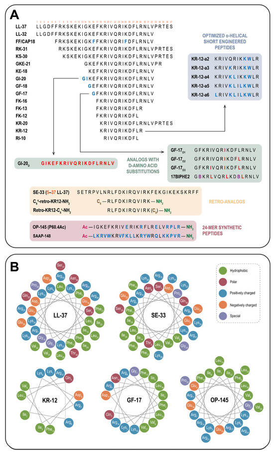 Amino acid sequences and structural characteristics of LL-37 and its analogs. (A) Comparative alignment of LL-37 and representative analogs, illustrating sequence modifications such as inversions, substitutions with D-amino acids or biphenylalanine (B), acetylation, and truncation. Modifications aim to optimize antimicrobial activity, reduce cytotoxicity, and enhance proteolytic resistance. Color coding: blue—canonical amino acid substitutions; red—substitution with D-amino acids; purple—substitution with biphenylalanine. (B) Helical wheel projections (heliograms) depicting the amphipathic nature of LL-37 and its analogs. The spatial distribution of hydrophobic, polar, and charged residues is visualized. Heliograms were created using Protein ORIGAMI web application. Color legend: green—hydrophobic residues; red—polar residues; blue—positively charged residues; orange—negatively charged residues; purple—residues with special properties.