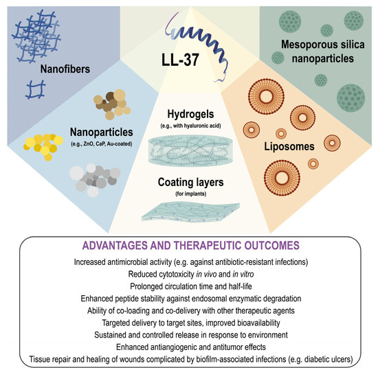 In addition to structural modification, an emerging strategy to improve the therapeutic potential of LL-37 is the use of nanoscale delivery systems (Figure 3) [134]. Encapsulation of peptides into liposomes, polymeric nanoparticles, or hydrogels enhances their stability and enables controlled release. These nanocarriers typically possess a net positive surface charge, facilitating selective electrostatic interaction with negatively charged bacterial membranes. Moreover, lipid-based encapsulation of peptides provides protection against proteolytic degradation.