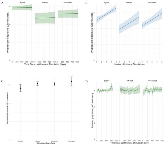 Model-based estimation of SARS-CoV-2-specific anti-S IgG and IgA dynamics. (A,B) Predicted anti-S IgG levels as a function of time since the last immune stimulation (A) and cumulative number of immune events (B). Individuals were grouped by immunity type into infected, vaccinated, and hybrid. Shaded areas represent 95% credible intervals based on a Bayesian model with skew-normal distribution. (C) Estimated plasma IgA levels by type of stimulation event. Immune stimulation events were grouped by type: vaccination, primary infection, reinfection, or booster immunization. Estimated marginal means (EEMs) of plasma IgA levels are shown with statistical credibility evaluated using 95% HPD intervals, based on an output of a Bayesian model with log-transformed Student’s t-distribution. (D) Predicted plasma IgA levels as a function of time since the last immune stimulation. Individuals were grouped by immunity type into infected, vaccinated, and hybrid. Shaded areas represent 95% credible intervals based on a Bayesian model with a log-transformed Student’s t-distribution.