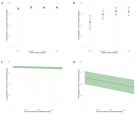 Model-based determinants of SARS-CoV-2 neutralization capacity against pre-Omicron and Omicron variants by infection history and time since the immune stimulation. (A,B) Predicted neutralization capacity (%) against pre-Omicron (A) and Omicron (B) variants by infection history. Individuals were grouped by their infection history into four categories: none (no infection), pre-Omicron infection only, Omicron infection only, or both (pre-Omicron and Omicron infections). Posterior medians are shown with 95% credible intervals based on a Bayesian model with skew-normal distribution. (C,D) Model-predicted neutralization capacity (%) against pre-Omicron (C) and Omicron (D) SARS-CoV-2 variants as a function of time since the last immune stimulation. Shaded areas represent 95% credible intervals based on a Bayesian model with skew-normal distribution.