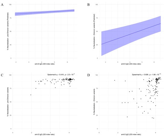 The direct, unadjusted association between anti-S IgG levels and neutralization capacity was analyzed using Spearman’s rank correlation. A moderate positive correlation was observed between anti-S IgG levels and pre-Omicron variant neutralization (ρ = 0.416, p = 2.5 × 10−5) (Figure 3A). In contrast, a stronger correlation was detected between anti-S IgG levels and Omicron variant neutralization (ρ = 0.606, p = 1.06 × 10−13) (Figure 3B). The neutralization capacity of both used variants was strongly associated with anti-S IgG antibody levels, even after adjusting for a previous infection history and the time since the last immune stimulation. Neutralization capacity against the pre-Omicron variant increased by 1.49% for each 1 unit increase in IgG OD index ratio (95% CI: 0.78–2.23) (Figure 3C). In comparison, neutralization capacity against the Omicron variant increased by 7.82% for each 1 unit increase in IgG OD index ratio (95% CI: 4.06–11.53) (Figure 3D).