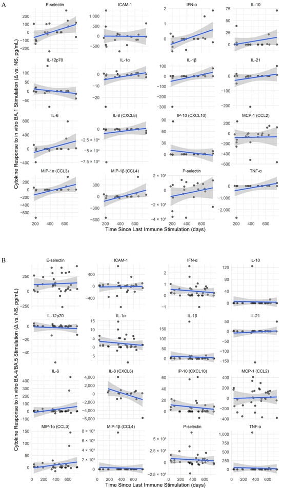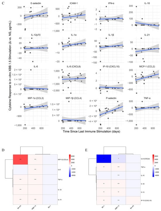 Under BA.1 stimulation conditions (Figure 5A), TNF-α (Spearman’s ρ = 0.469) and E-selectin (Spearman’s ρ = 0.465) showed positive correlations with time. For BA.4/BA.5 stimulation (Figure 5B), IL-8 (CXCL8) showed a moderate negative correlation with time (Spearman’s ρ = −0.365). In the case of XBB.1.5 stimulation (Figure 5C), the highest correlation with time was for P-selectin (Spearman’s ρ = 0.358). Also, all stimulations induced a slight increase in IL-21 levels over time. However, despite these trends, all correlations were modest and non-significant after correction for multiple comparisons.