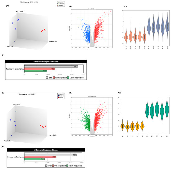 Transcriptomic analysis of seminoma and teratoma. (A) 3D PCA plot showing clear separation between seminoma (blue) and normal (red) samples (PC1 = 69.0%, PC2 = 11.2%, PC3 = 5.4%); (B) volcano plot of seminoma versus normal tissues (|log2FC| > 1, FDR < 0.05) (Blue dots: underexpressed genes; Red dots: overexpressed genes.); (C) violin plots of expression distributions: seminoma (S-1–S-5) versus normal (N-1–N-5); (D) bar chart of differentially expressed genes in seminoma; (E) 3D PCA plot for teratoma (blue) versus normal (red) samples (PC1 = 69.0%, PC2 = 8.9%, PC3 = 7.3%); (F) volcano plot of teratoma versus normal tissues (|log2FC| > 1, FDR < 0.05) (Green dots: underexpressed genes; Red dots: overexpressed genes.); (G) violin plots of expression distributions: normal (N-1–N-5) versus teratoma (T-1–T-5); (H) bar chart of differentially expressed genes in teratoma. These panels confirm distinct transcriptional profiles and extensive differential gene expression in both seminoma and teratoma compared to normal gonadal tissue.