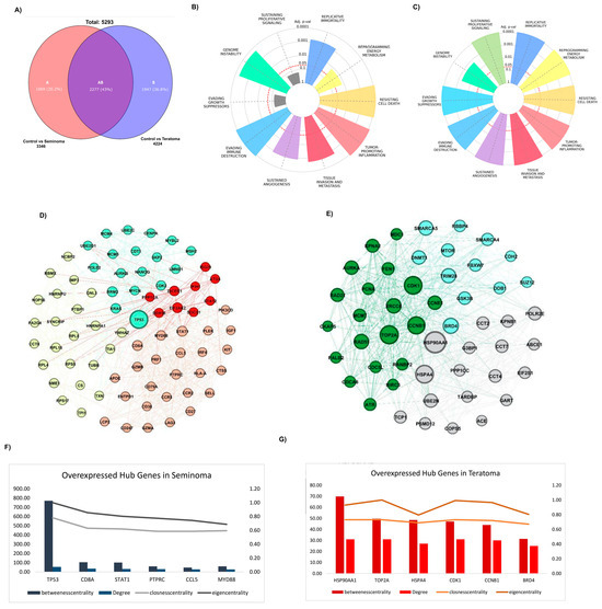 Hub gene identification in seminoma and teratoma. (A) Venn diagram of DEGs; hallmark enrichment for specific genes of seminoma (B) and teratoma (C) hubs, showing top cancer-related pathways (–log10 adj p-value); PPI networks for seminoma (D) and teratoma (E) hub genes; centrality metrics (betweenness, degree, closeness, eigenvector) for overexpressed hub genes in seminoma (F) and teratoma (G), highlighting top influencers.