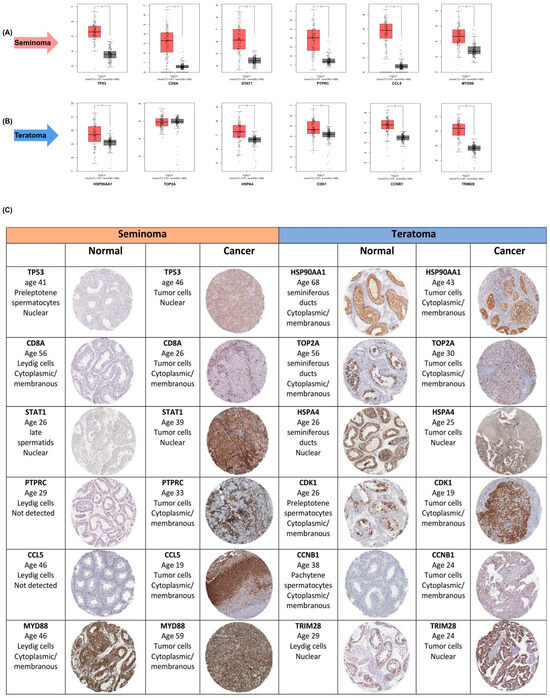 Validation of hub -gene expression in seminoma and teratoma. (A) Boxplots from GEPIA comparing mRNA levels of six seminoma hub genes—TP53, CD8A, STAT1, PTPRC, CCL5, and MYD88—in tumor versus normal testicular tissue (p < 0.01); (B) boxplots from GEPIA comparing mRNA levels of six teratoma hub genes—HSP90AA1, TOP2A, HSPA4, CDK1, CCNB1, and TRIM28—in teratoma versus normal tissue (p < 0.01); (C) representative immunohistochemistry images from the Human Protein Atlas showing protein expression for the same hub genes in normal and cancerous tissues. These data confirm both transcript- and protein-level overexpression of key hub genes in their respective tumor subtypes. Asterisks (*) indicate statistically significant differences (p < 0.05).