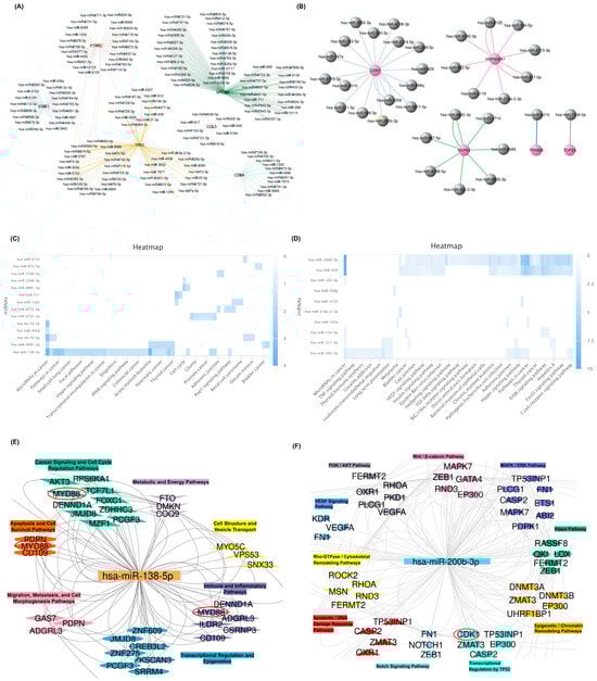 MiRNA–target gene networks and pathway enrichment in seminoma and teratoma. (A) The miRNA–gene interaction network for seminoma hub genes. (B) The miRNA–gene interaction network for teratoma hub genes highlights distinct modules centered. Each gray node indicates validated miRNA predicted to regulate a given seminoma hub gene. (C) Heatmap of seminoma-associated miRNA pathway enrichment. Rows represent individual miRNAs, columns show cancer-related pathways on the x-axis, and color intensity (blue gradient) corresponds to –log10 (adjusted p-value). (D) Heatmap of teratoma-associated miRNA pathway enrichment. Each row is a miRNA, each column is a pathway, and blue shades indicate higher enrichment. (E) Functional clustering of hsa-miR-138-5p targets in seminoma. (F) Functional clustering of hsa-miR-200b-3p targets in teratoma. Collectively, these panels demonstrate how hsa-miR-138-5p and hsa-miR-200b-3p arrange tumor-specific pathways by targeting distinct sets of hub genes.